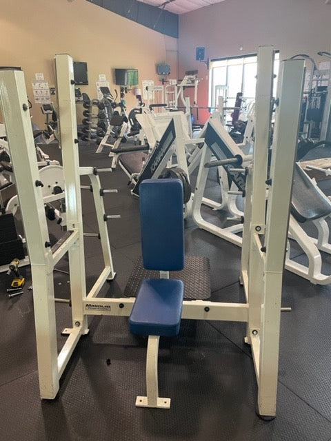 he Magnum Olympic Shoulder Bench allows for front and rear takeoffs connected with a bottom stop bar. A total of 10 weight-storage horns make room for 20.4-kg / 45-lb. plates stored at waist height. Molded urethane guards protect Olympic bars from damage, reduce noise and provide a hand rest for spotters. The frame features a proprietary two-coat powder finish for long-lasting durability. Comes standard with built-in spotter platform (MG-AOSP). Designed to meet EN957 and ASTM safety standards.